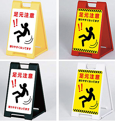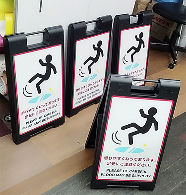 下部に余白を設けて英語の注意喚起を追加したほか、床が滑りやすいことを直感的に伝えるため、足元に濡れた床のイラストを配置しています。